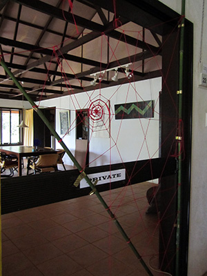An empty mosquito screen frame in my home provided the ideal support for my piece to work on (far right). I wanted to let the lace develop its own shape as I went along. Since the work was meant to be shown outside the gallery and thus exposed to varying weather conditions, my material choices had to be weather proof. I used Polyester builders line which meant that I could melt off threads and knots.