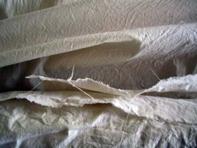 I mixed the pigments in the ratio directed by the manufacturer. I first painted the thin part of a piece of white, lacy paper mulberry bark cloth and also the other end where the fibres are coarser and more densely spaced. That way I could appreciate the difference. My cotton mull dropcloth now has traces of the paint mix from seeping through the tapa.
